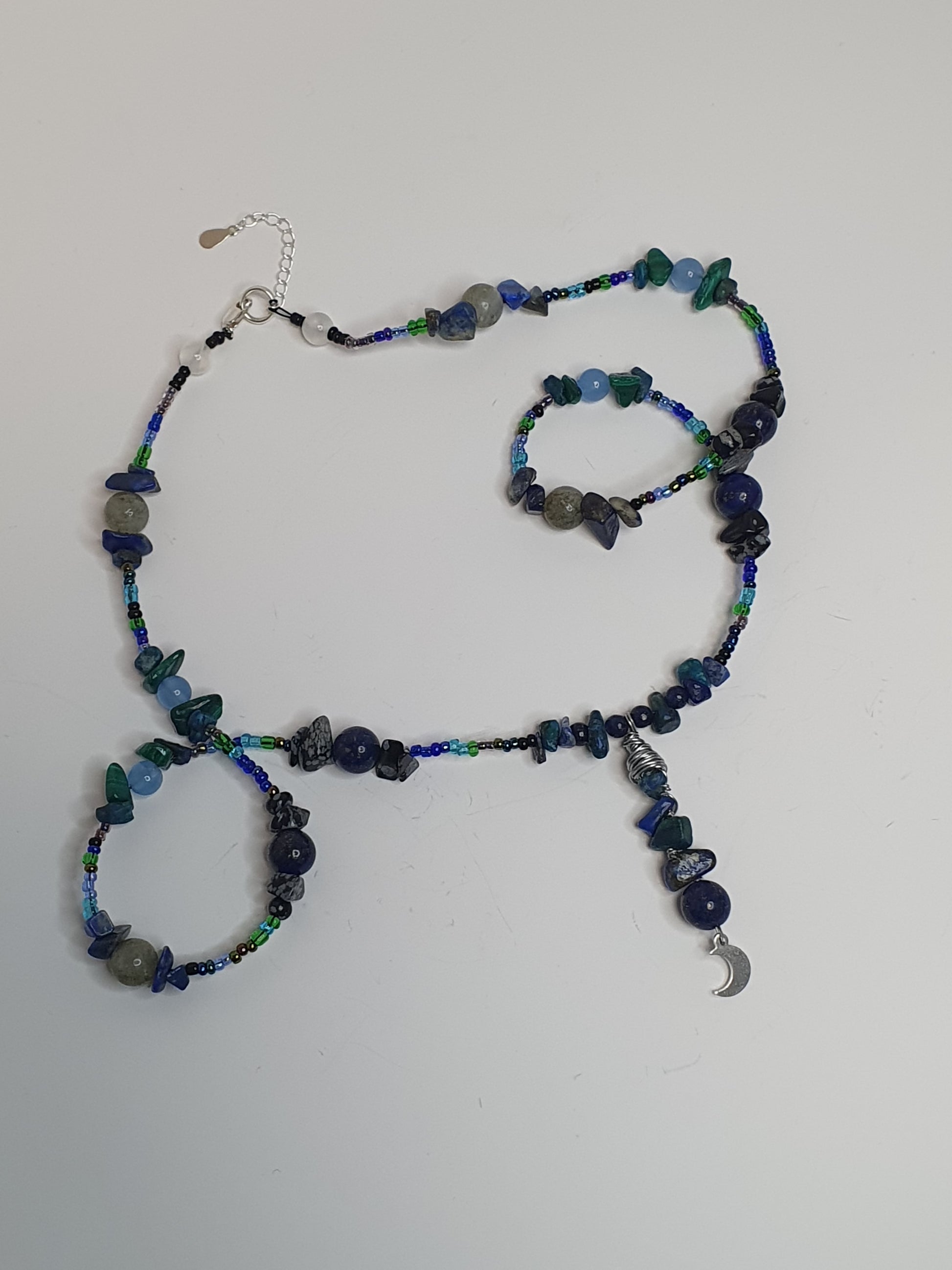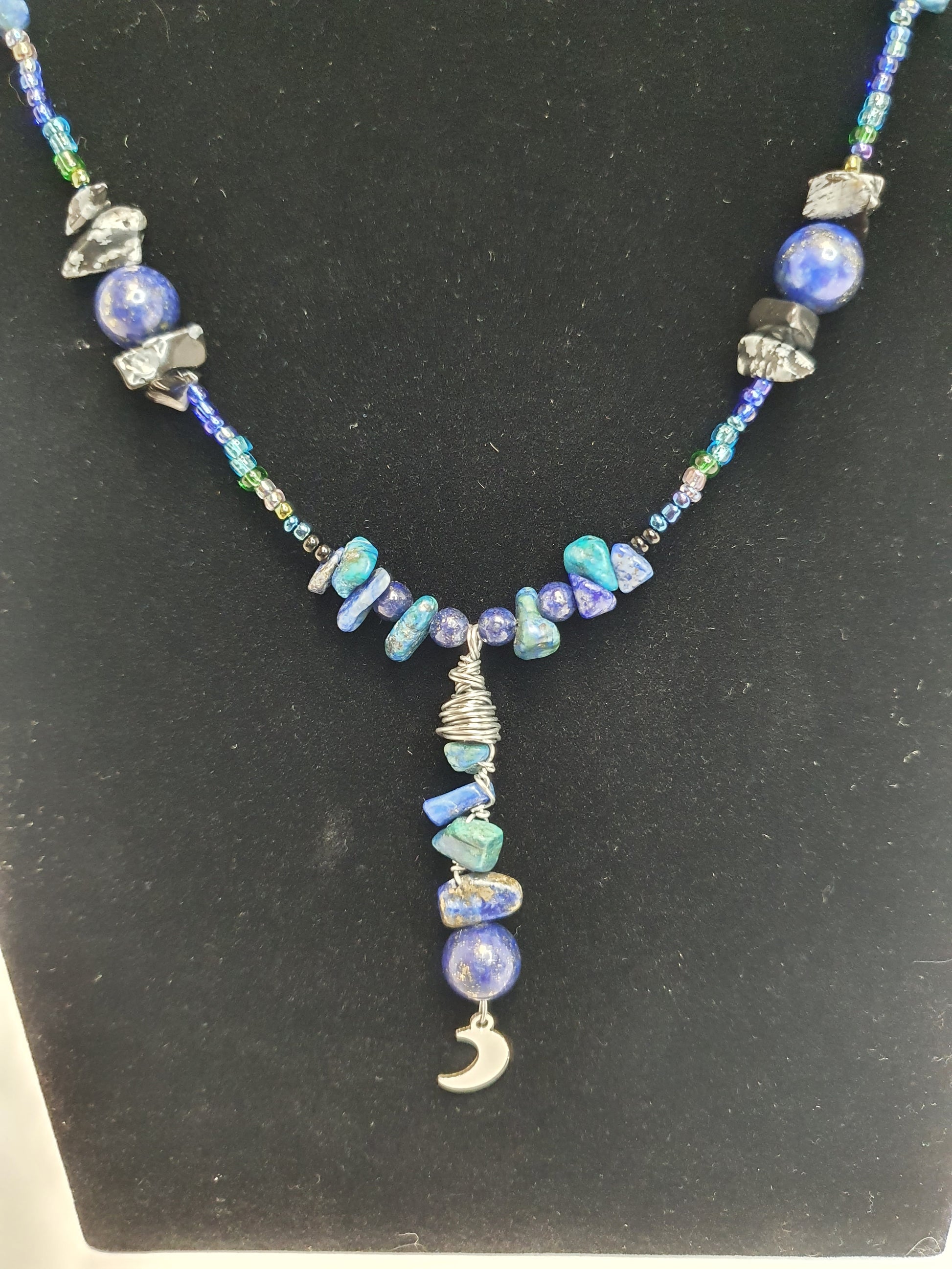 This beatiful Lapis Lazuli and Chrysocolla necklace also contains Chalcedony, Malachite, Labradorite, Snowflake Obsidian and Selenite. All fixings are sterling silver and the wire wrap is hypoallergenic jewellers steel. It comes with a lobster claw fasten and 4cm sterling silver extender. All crystals are cleansed and charged.