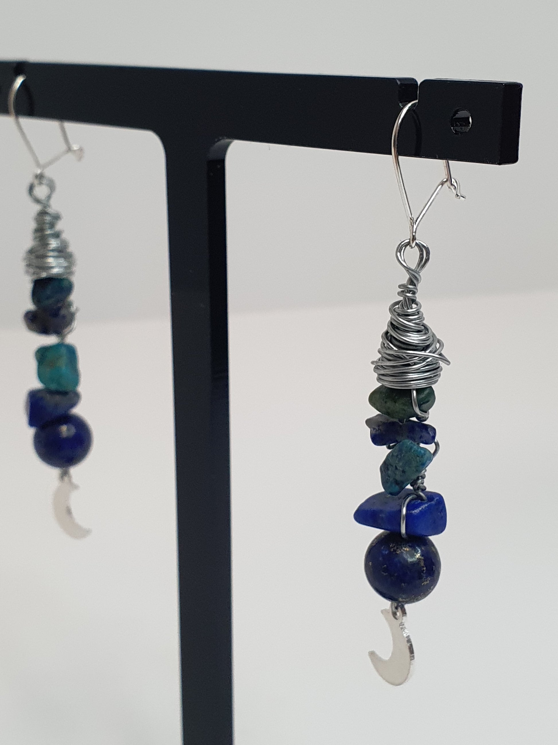 Handmade Lapis Lazuli and Chrysocolla earrings with silver moon charm. All earrings are on 925 silver posts with 925 silver charms and fixings, wire is steel and all jewellery hypoallergenic. Matching products available.