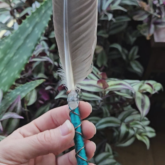 The copper twist on the handle and positioning of the crystal allows the user to add extra energy and intentions when spreading sacred smoke around a room or person. The fan can also be used without smoke in a sweeping motion to clear energy from a person or object.