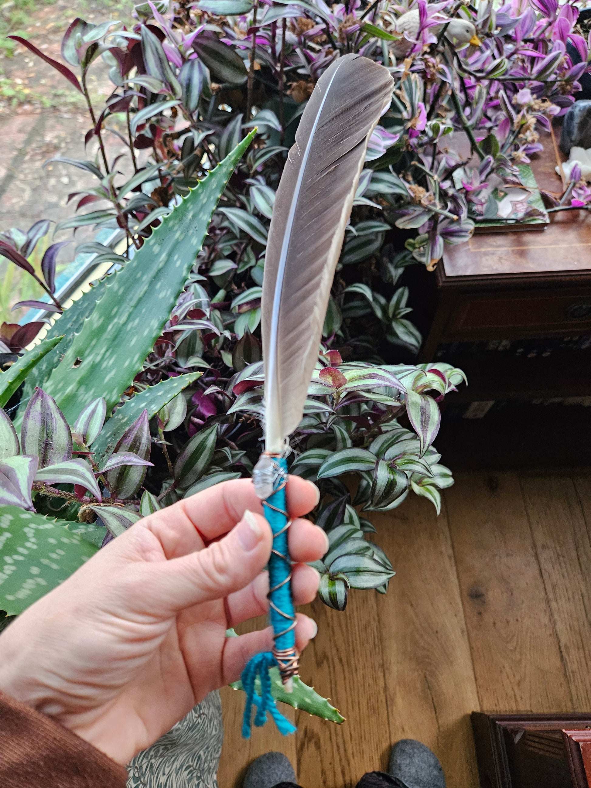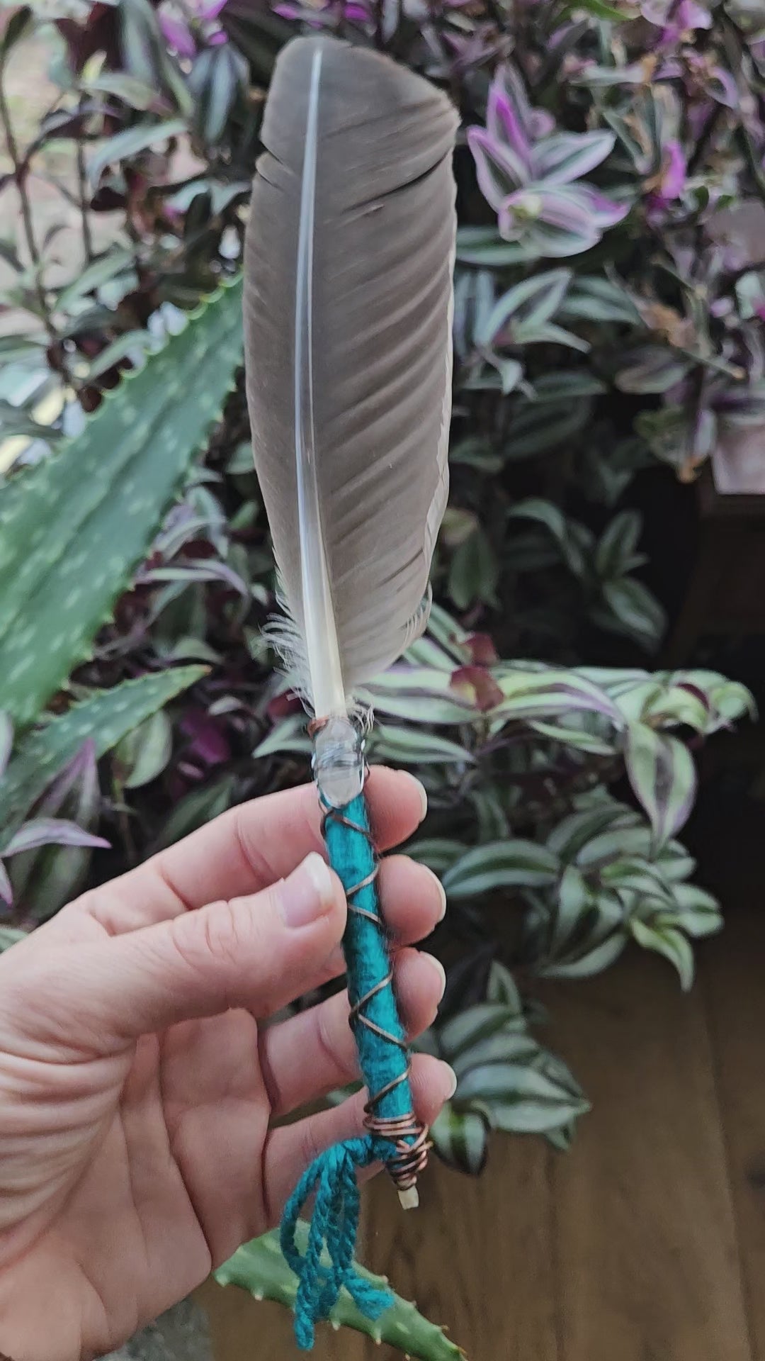 Smudge feather inlaid with quartz point. The feathers are all naturally foraged wild goose feathers from the West Yorkshire moorlands.