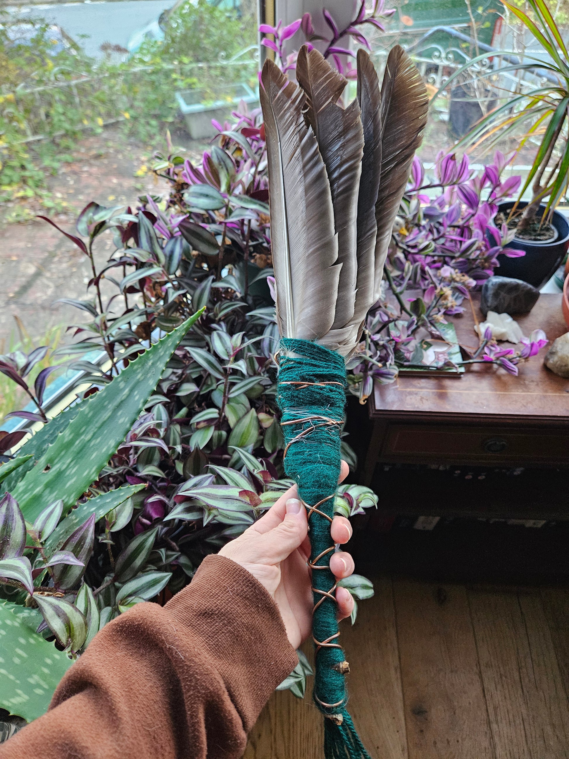 Please note all fans are made using naturally foraged items and so some of the feathers may appear damaged. This damage just shows us why the bird removed the feathers. We think it adds to the charm of using the products and energy of the land around us.