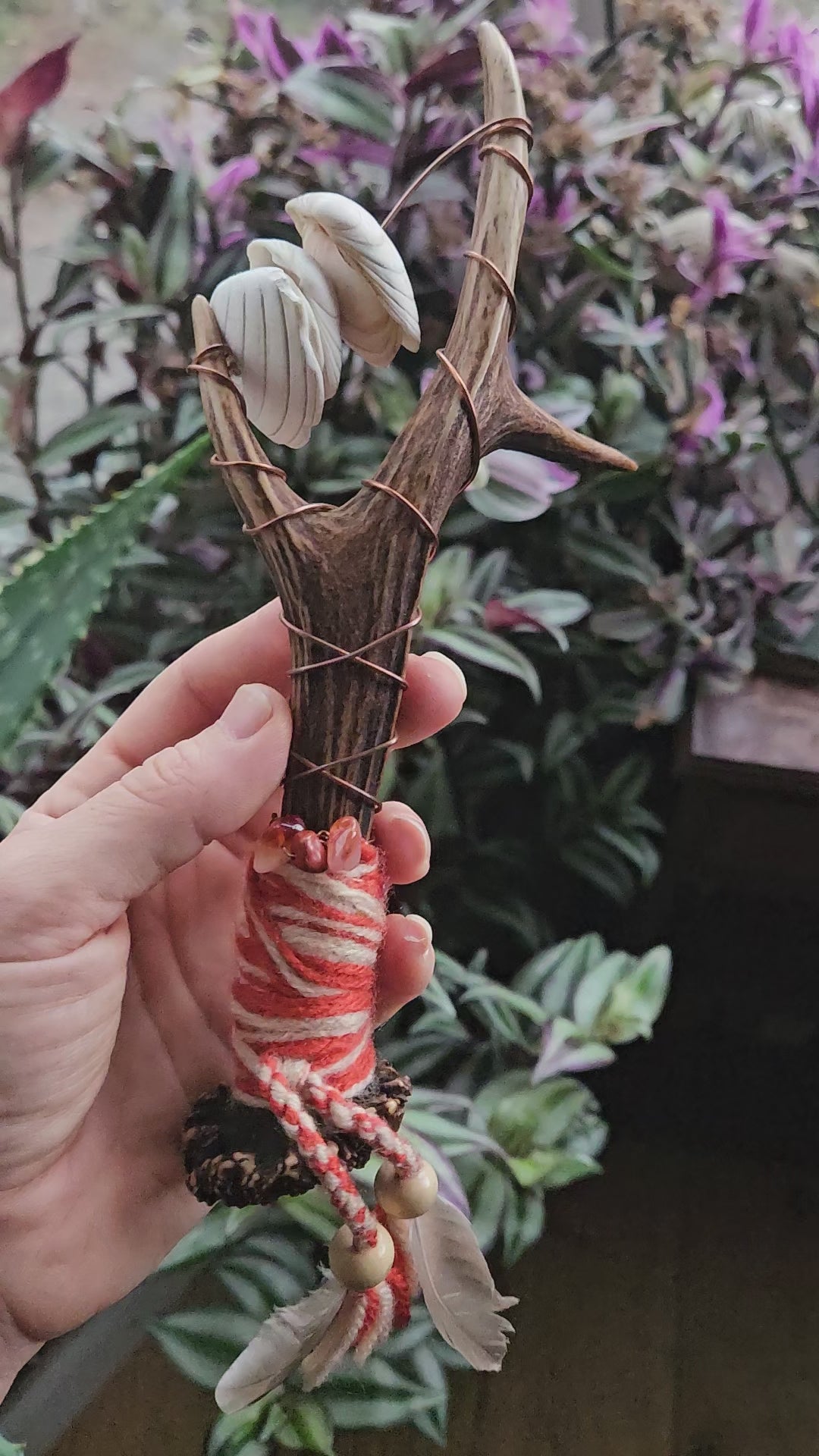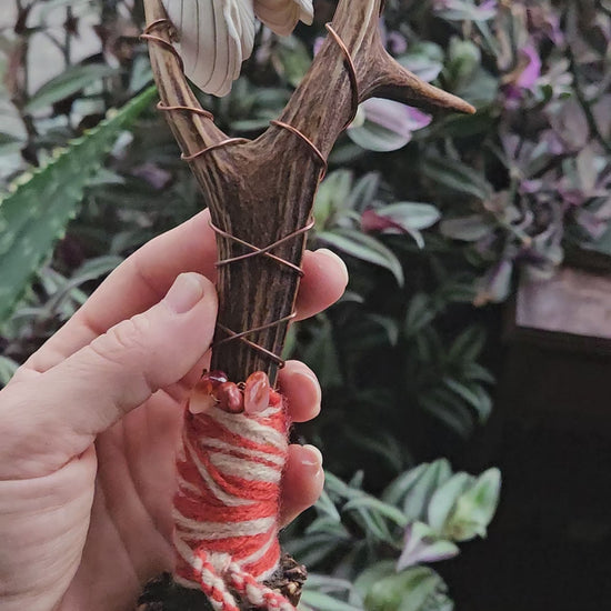 A beautiful Scottish deer antler sistrum rattle. Featuring shells from Pittenweem on the Fife coast, Scotland. The handle is imbued with Carnelian and Red jasper. Copper wire runs down the handle and this piece also features naturally sourced wild goose feathers. Using copper allows the practitioner to channel their energy down the rattles and out into the sound waves. The colours and crystals in this rattle resonate with the sacral and root chakras bringing both creative and grounding energies to the practitioner. Suitable for use in sound baths, energy clearing and healing sessions.