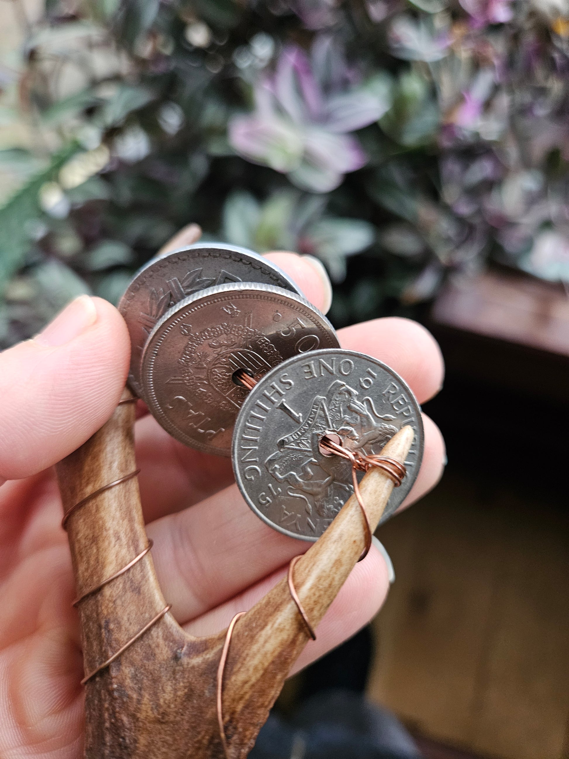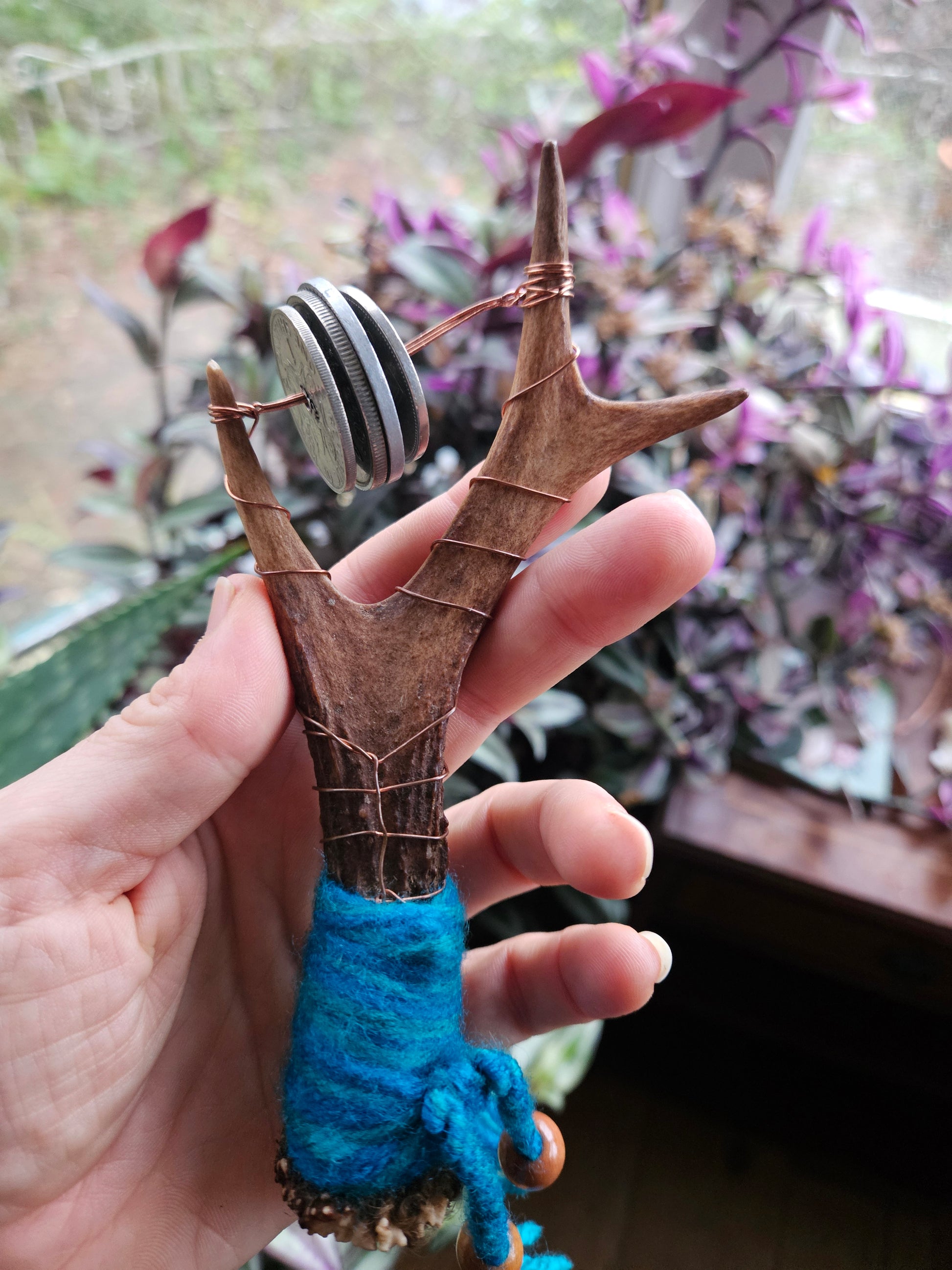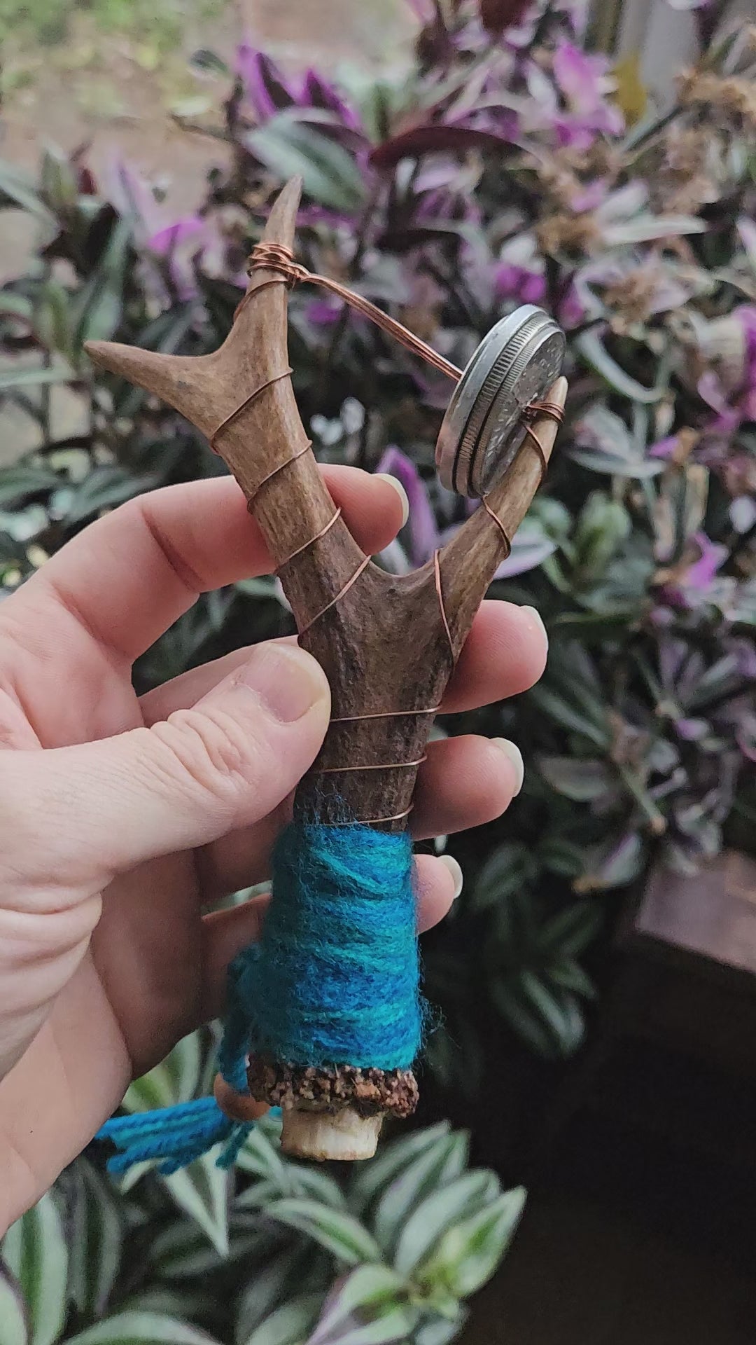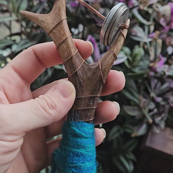 A beautiful small Scottish deer antler sistrum rattle. Featuring world coins and copper wire handle. Using copper allows the practitioner to channel their energy down the rattles and out into the sound waves. Blue colours bring wisdom, water, truth and masculine energies.